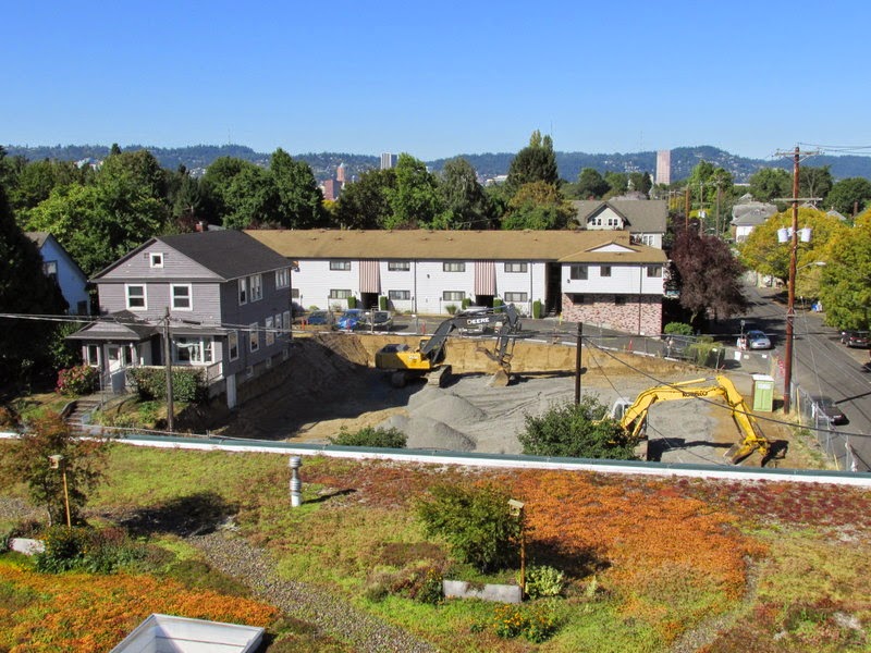Peeking over into downtown. We think this hole will become a four-story apartment complex.