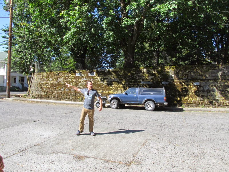 Khris explained how Portland once had a goodly number of gullies, which were evened out by sluicing out the roads.  Here he is pointing out that the original level was at the top of this wall (the ground was even with the graves in Lone Fir Cemetery) and the road was dug out and used to fill a gully down the road.