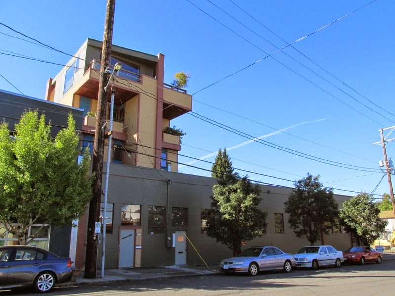 We then walked across the street to get a better vantage point for Emily’s neighbor Thom Ross, who is a woodworker.  He and two other people bought this building to use as work space.  Thom still has a work space, but he also has built a house in his portion of the building.  You can see how it has risen up out of the one-story building.