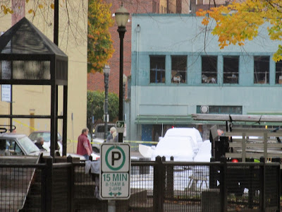 Across the street from this stop for the #6, are two houses, both alike in dignity/ in fair Portland where we lay our scene. They are also apparently owned by the same person, who painted them the same color.