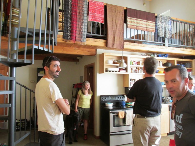 We then walked across the street to get a better vantage point for Emily’s neighbor Thom Ross, who is a woodworker. He and two other people bought this building to use as work space. Thom still has a work space, but he also has built a house in his portion of the building. You can see how it has risen up out of the one-story building.