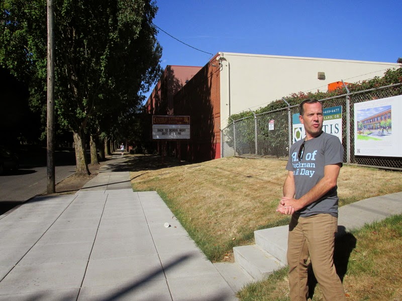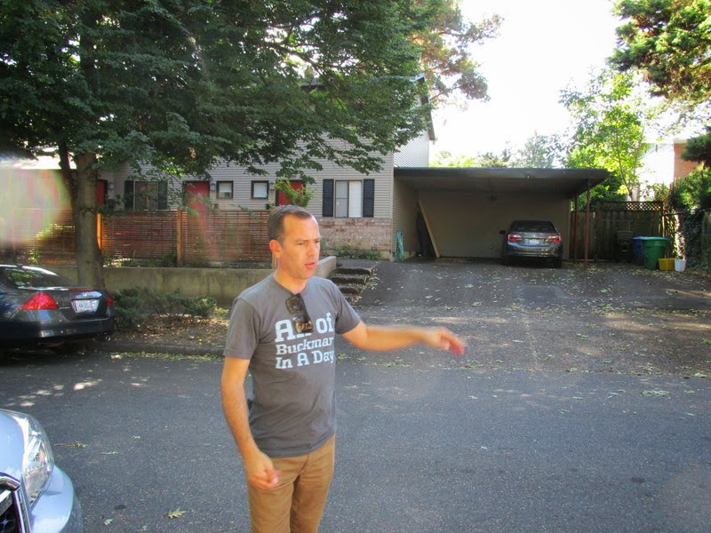 Khris explained how Portland once had a goodly number of gullies, which were evened out by sluicing out the roads. Here he is pointing out that the original level was at the top of this wall (the ground was even with the graves in Lone Fir Cemetery) and the road was dug out and used to fill a gully down the road.