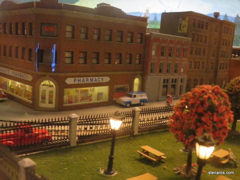 In this cute streetscape, a Santa rode a bicycle around the building on a loop. It’s not only the trains that move!