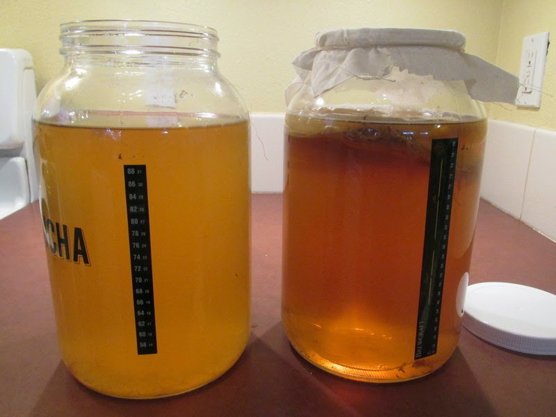 This is a new batch on the right and a finished batch on the left.  The scoby’s grow “mothers” which are baby scobys you can give away or use to start more batches.  I’ve given one away and used one to start a new batch.  You can sort of see the scoby in the jar on the right.  It’s that grayish looking thing floating on the top.