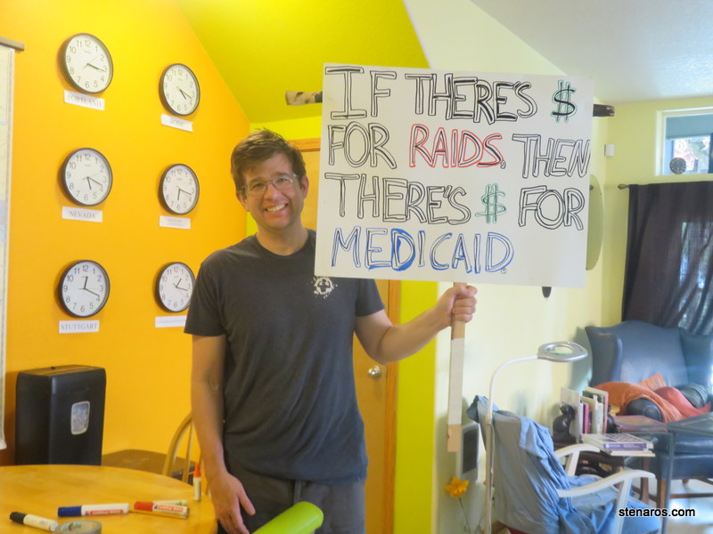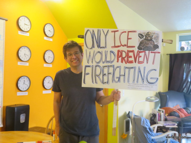 This side of the sign references ICE’s decision to check IDs and make arrests in the middle of a firefighting effort.