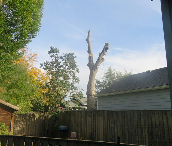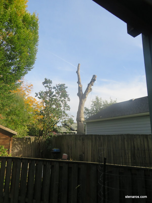 I’m not one to be sentimental over trees. I celebrated when the huge oak in my mom’s back yard laid itself down in an ice storm. But this had been such a big part of my life at the Orange Door, both indoors and out. It provided a nice green blotch on the southeast part of the property, and I’ve watched from my desk as squirrels run from the fir tree in Leo’s yard along the fence to the walnut tree and back.