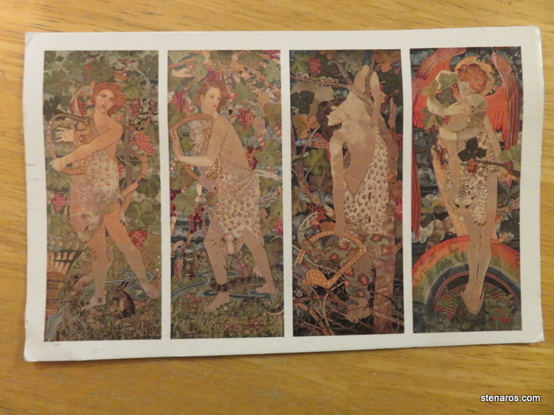 Sara writes that she enjoyed these pieces and thought I would like it too because it’s all embroidery. They are by Phoebe Anna Traquair and the pieces are (I assume) a collected work called The Progress of a Soul, with each individual piece named the Entrance, the Stress, Despair, and the Victory.