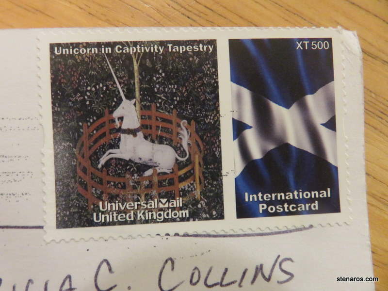 Sara wrote part of the postcard on a bus to Stirling Castle. Apparently the whole wedding crew were traveling together on a coach and a van. It’s about 75 guests, so a big crowd.