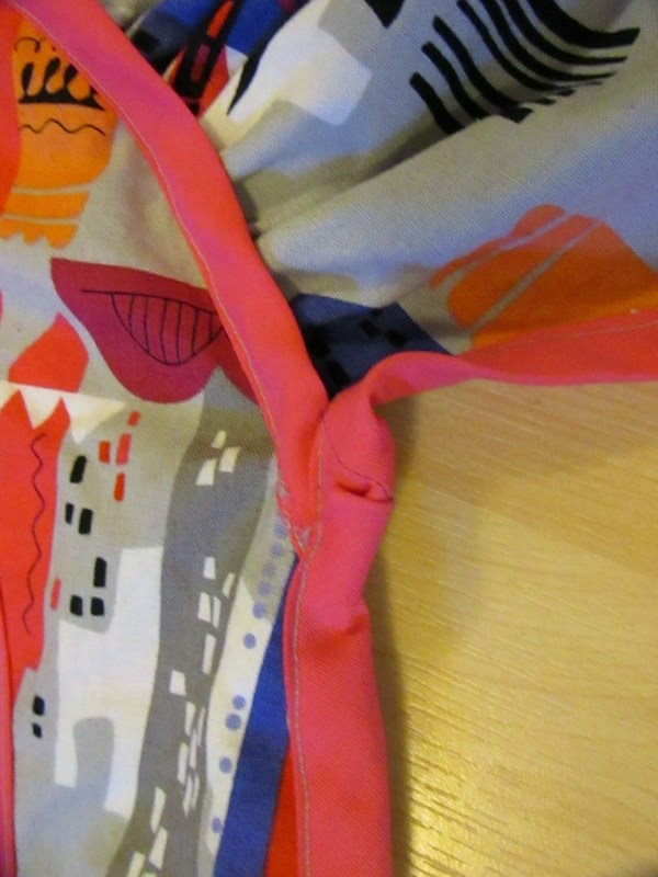 This was supposed to be done for the first day of school. Unlike the other two aprons I made last year, this one has half-inch binding instead of quarter inch. I wasn’t paying attention when I bought and I couldn’t get back to the fabric store, so I rolled with it. I like the quarter-inch binding better, but this is okay. I adore the material, which looks like Portland in the winter, with the grey background and the colorful buildings and the bridges. I think the pink ties everything together nicely.